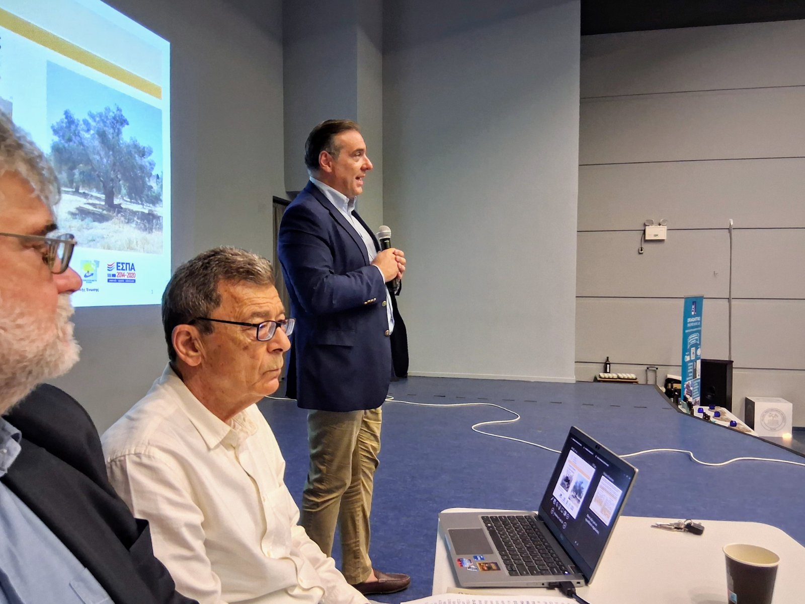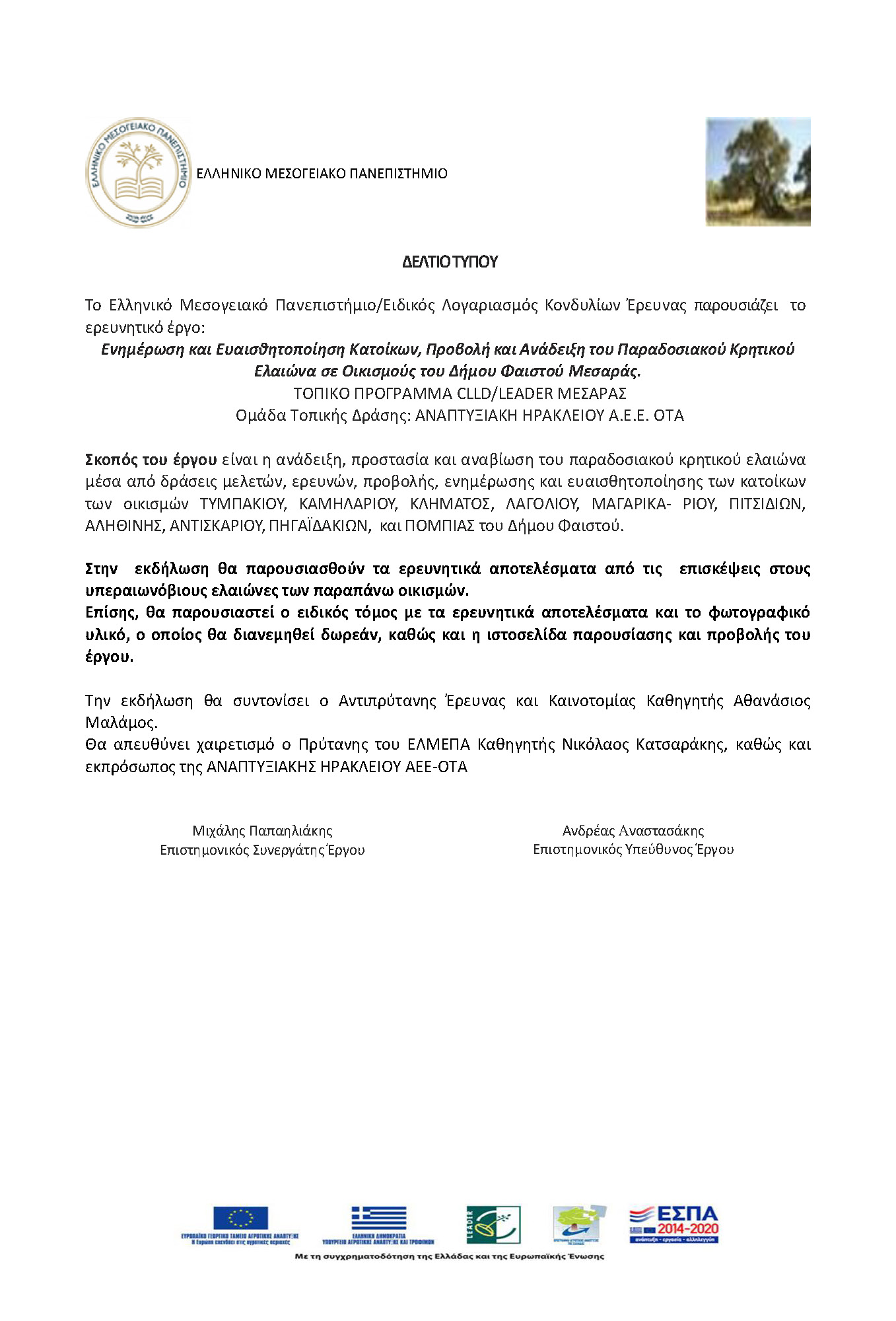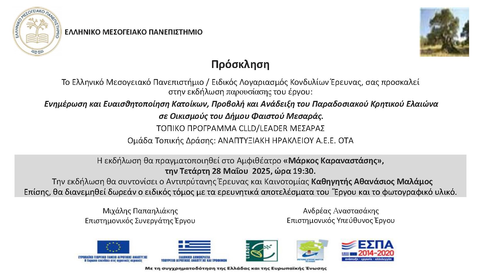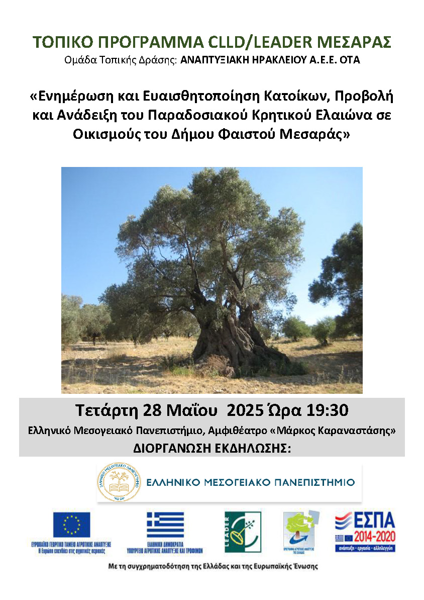 Την Τετάρτη 28 Μαΐου 2025 πραγματοποιήθηκε εσπερίδα-εκδήλωση παρουσίασης του έργου και των ερευνητικών αποτελεσμάτων του στο Αμφιθέατρο «Μάρκος Καραναστάσης» του Ελληνικού Μεσογειακού Πανεπιστημίου (ΕΛΜΕΠΑ). το Γραφείο Τύπου του ΕΛΜΕΠΑ δημοσιοποίησε ανοιχτή πρόσκληση στον ιστότοπο του Ιδρύματος καθώς και επίσημη πρόσκληση στους Δήμους Μαλεβιζίου, Αρχανών Αστερουσίων, Μινώα Πεδιάδας, Βιάννου, Γόρτυνας, Φαιστού, σε όλα τα Επιμελητήρια Ηρακλείου, στην Αρχιεπισκοπή Κρήτης, στη Μητρόπολη Γορτύνης και Αρκαδίας και στα τοπικά ηλεκτρονικά και έντυπα μέσα ενημέρωσης, και στην Αναπτυξιακή Ηρακλείου ΑΕΕ-ΟΤΑ. Η συμμετοχή των εκπροσώπων των τοπικών φορέων καθώς και μελών της ακαδημαϊκής κοινότητας του ΕΛΜΕΠΑ ήταν μαζική. Κατά τη διάρκεια της εκδήλωσης προσφέρθηκε coffee brake και στο τέλος της έγινε δωρεάν διανομή του τόμου της έρευνας του αρχαίου-παραδοσιακού ελαιώνα στο Δήμο Φαιστού Μεσαράς. Την εκδήλωση συντόνισε ο Αντιπρύτανης Έρευνας και Καινοτομίας του ΕΛΜΕΠΑ Καθηγητής κ. Μαλάμος Αθανάσιος και χαιρέτισαν ο Πρύτανης του ΕΛΜΕΠΑ Καθηγητής Κατσαράκης Νικόλαος, ο Αντιπεριφερειάρχης διασύνδεσης της Περιφέρειας Κρήτης με τα ΑΕΙ της Κρήτης κ. Ματαλλιωτάκης Γεώργιος, ο εκπρόσωπος της Αναπτυξιακής Ηρακλείου ΑΕΕ-ΟΤΑ και Αντιπεριφερειάρχης Αγροτικής Οικονομίας κ. Τζεδάκης Δημήτρης και ο Πρόεδρος του πρώην ΤΕΙ Κρήτης Καθηγητής κ. Καπετανάκης Βαγγέλης. Στην εκδήλωση έγιναν εισηγήσεις – παρουσιάσεις από τον επιστημονικό υπεύθυνο του έργου Λέκτορα ΕΛΜΕΠΑ Ανδρέα Αναστασάκη και τον επιστημονικό συνεργάτη του έργου Προϊστάμενο της Διεύθυνσης Αγροκτήματος ΕΛΜΕΠΑ Μιχάλη Παπαηλιάκη αφενός για τα ερευνητικά αποτελέσματα του έργου και αφετέρου για την ιστορική, πολιτιστική και παραγωγική αξία του αρχαίου παραδοσιακού κρητικού ελαιώνα. Μετά τις εισηγήσεις ακολούθησε διάλογος των εισηγητών με τους παρευρισκόμενους.